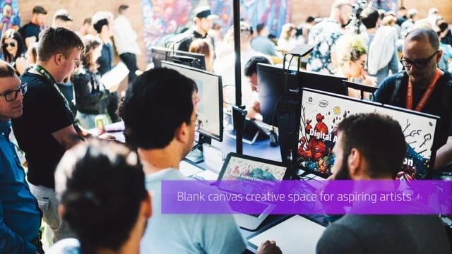 The activations and engagements inside and out were all powered by HP Z products—in particular, the ZBook x2. Outside there were product vignettes and tables in a patio space for attendees to relax in. Brand ambassadors in hip jean jackets with branded HP and Intel pins welcomed attendees and directed them around the event. A “Keep Reinventing” neon sign hung above the entrance.
